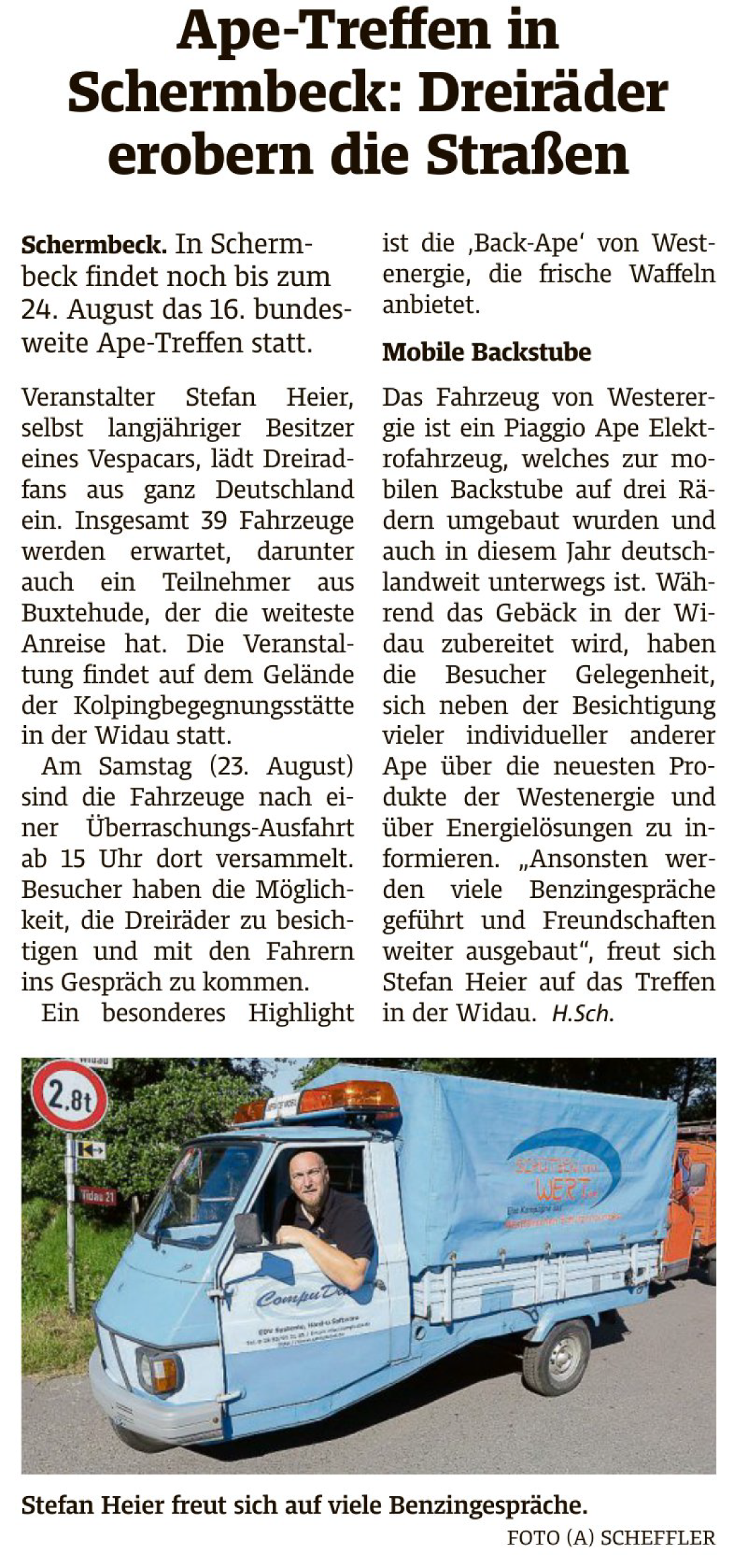 Schermbeck-online vom 27.08.2018 https://schermbeck-online.de/ape-fahrer-haben-einen-knall/ Dorstener Zeitung 27.08.2018